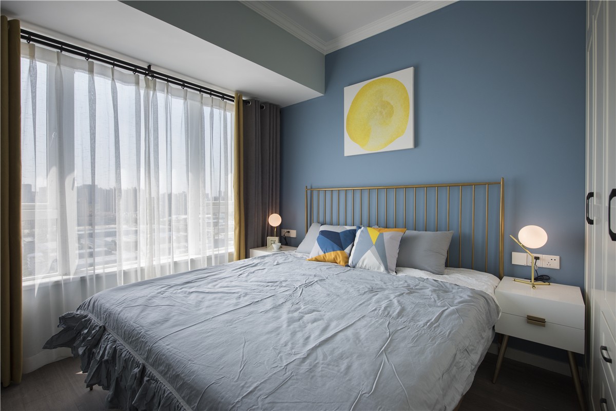室内主卧装修案例,通过拆除主卧空间原有的飘窗来扩大主卧空间,满足两个床头柜的需求。